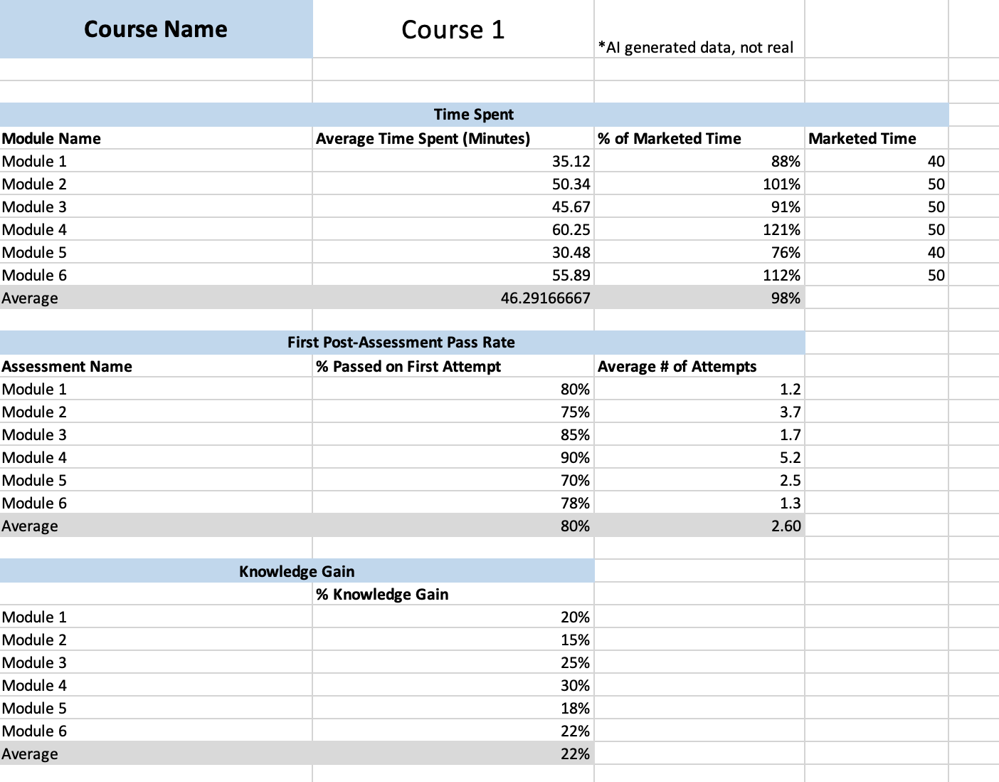 The purpose of the product health dashboard was to provide a comprehensive reference of important data metrics about an educational product for internal stakeholders to view. The dashboard was organized in Excel by a description of each key performance indicator, a visualization of how each course in the product performed against benchmarks, and a detailed breakdown of metrics for each course. Through these spreadsheets, stakeholders could quickly understand how the product is currently doing and what steps can be taken to improve metrics on the next development cycle.